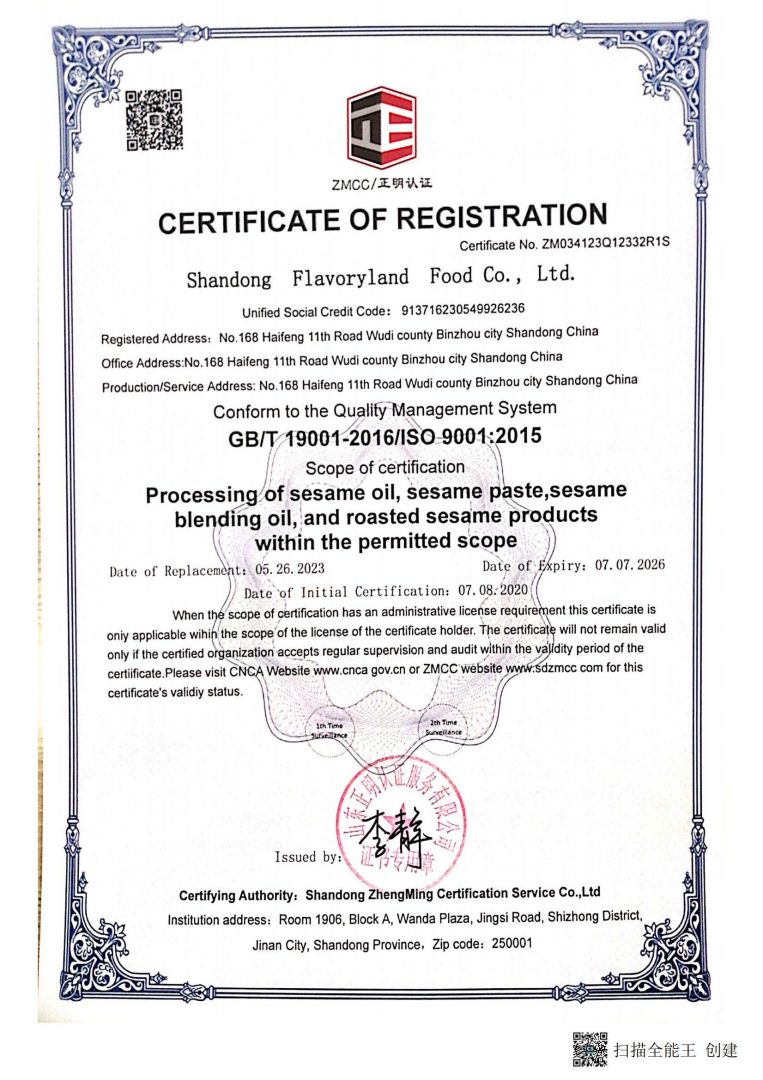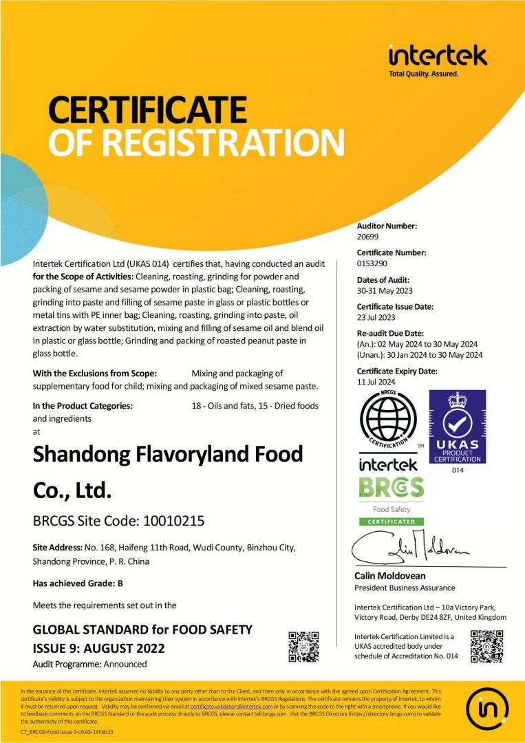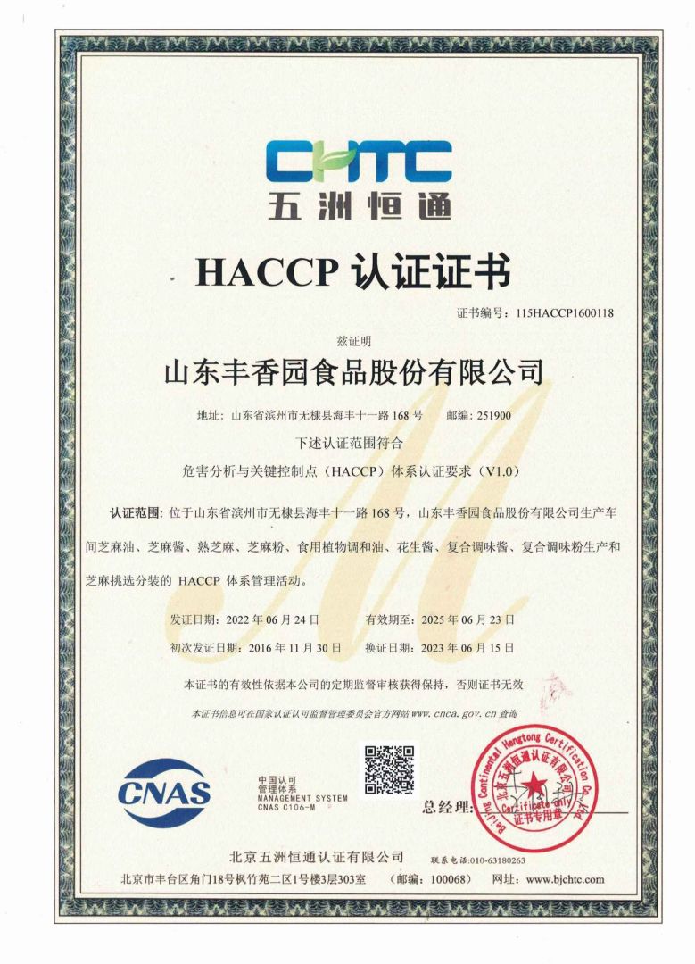 ? ? 豐香園小磨香油、芝麻調(diào)和油、花生醬、芝麻醬、混合醬、熟芝麻制品均已通過英國零售商協(xié)會BRC認(rèn)證、歐盟 美國和國內(nèi)有機、HACCP體系認(rèn)證,是山東省出口食品備案企業(yè)。